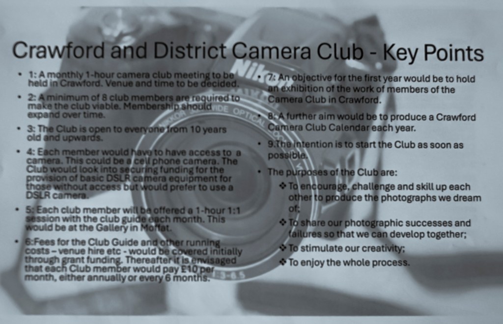The Crawford Camera Club is now up and running. If you would like to join, please get in touch with me and we can discuss details. No previous experience or lots, there is room for everyone. You can start with a phone and move on to a camera at a later date if you wish.